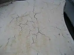 O aparecimento deste defeito indica que a resina se decompôs com o tempo devido às condições atmosféricas, nomeadamente a luz solar.