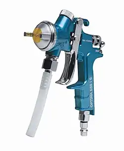 Existe ainda uma combinação do sistema convencional com o sistema airless, conhecido pelo seu acrónimo inglês HVLP – high volume-low pressure, alto volume-baixa pressão, no qual o ar comprimido é usado tanto para pressurizar a tinta como para ajudar à atomização no bico da pistola e é actualmente o método mais usado para pequenas áreas de pintura com requisitos de elevada qualidade como são o caso dos automóveis.