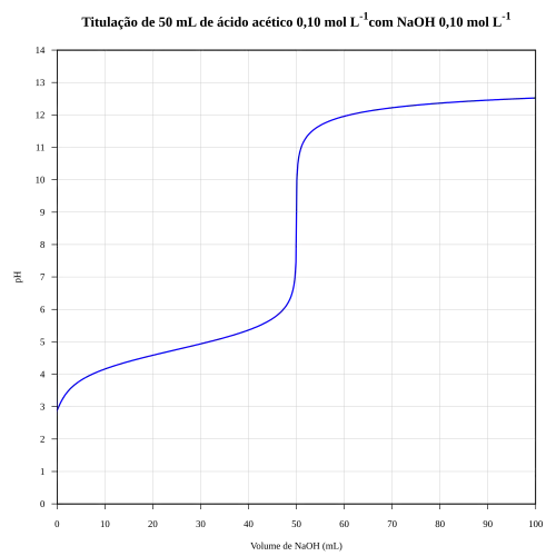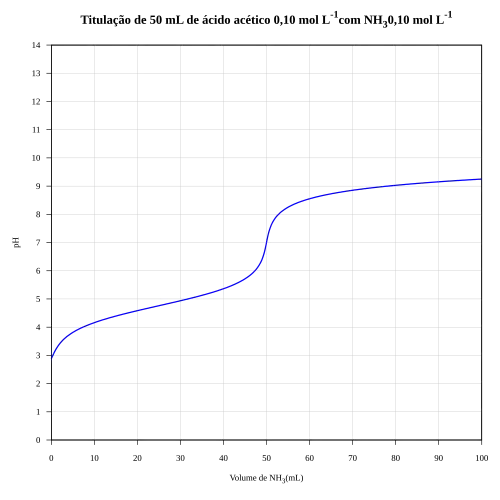 A curva de neutralização até o ponto de equivalência é quase idêntica à do caso em que se usa hidróxido de sódio 0,1 M (0,1 N) como base; além do ponto de equivalência, a titulação consiste virtualmente na adição de uma solução aquosa de amônia 0,1 M (0,1 N) a uma solução 0,1 M de acetato de amônio.