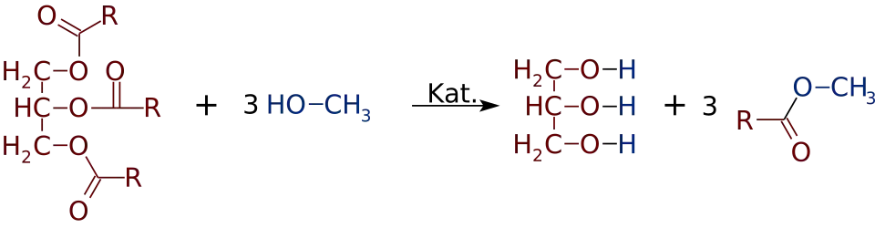 Nesse processo, obtém-se um éster metílico de ácido graxo (Biodiesel) e glicerina como subproduto, que é removida por decantação. O éster metílico de ácido graxo formado possui uma viscosidade menor que o triacilglicerol utilizado como matéria-prima.