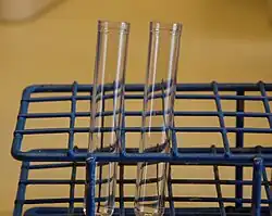 Tubo de ensaio é um recipiente usado para efetuar reações químicas de pequena escala com poucos reagentes de cada vez. [1]