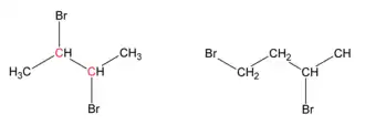 Da mesma forma em um gem-dibrometo o prefixo gem, uma abreviação de geminal, sinaliza que ambos os átomos de bromo são ligados ao mesmo átomo. Por exemplo, 1,1-dibromobutano é geminal.