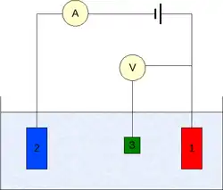 Para iniciar um experimento precisa-se ao menos dois eletrodos. O eletrodo de trabalho, que faz contato com o analito, deve aplicar o potencial desejado de uma maneira controlada e facilitar a transferência de elétrons para o analito. Um segundo eletrodo atua como a outra semicélula. Este segundo eletrodo deve ter um potencial conhecido com o que medir o potencial do eletrodo de trabalho, além do mais, devem-se equilibrar os eletrodos adicionados ou eliminados pelo eletrodo de trabalho. Se bem esta é uma configuração viável, tem uma série de deficiências. Mas significativamente, é extremadamente difícil para um eletrodo manter um potencial constante enquanto se passa a corrente para fazer frente aos eventos redox do eletrodo de trabalho.