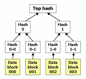 Uma árvore de Merkle é uma árvore binária de dispersão onde as folhas são separações de blocos de dados em um arquivo ou conjunto de arquivos. Os nós localizados mais acima na árvore são as dispersões de seus respectivos filhos. Por exemplo, na imagem dispersão 0 é o resultado da dispersão 0-0 e depois, dispersão 0-1 hash. Ou seja, dispersão 0 = dispersão(dispersão 0-0 || dispersão 0-1), onde || denota a concatenação.