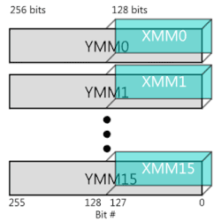 O AVX utiliza dezesseis registradores YMM. Cada registrador YMM contém: