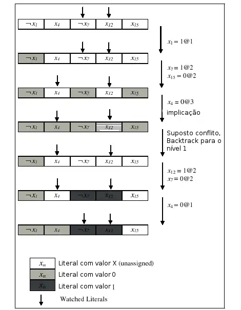 Sabemos que há dois ponteiros podendo apontar e para . Seja @(<valor da variável>@<nível de decisão>), logo os ponteiros não mudam de posição. Seja @ e @ então um ponteiro aponta para (em zChaff os ponteiros se movem livremente) e o outro não muda de posição. Seja @ implicando que assuma o valor 1, tornando a cláusula satisfeita. Entretanto, suponha que no banco de dados das variáveis, gera um conflito, então um backtracking é executado ao nível de decisão 1 (nível inicial de acordo com o exemplo), apagando todas as decisões posteriores a este nível. A configuração atual é um ponteiro apontando para e outro apontando para já que quando é executado um backtracking em zChaff não é necessário refazer o apontamento inicial dos ponteiros. Seja @ e @, temos então que a cláusula assume o valor 1 e não é mais visitada. Em zChaff, encontrando uma atribuição que faz com que a cláusula seja 1, os ponteiros se movem também (diferentemente de SATO).
