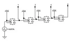É um circuito divisor de frequência, ou seja, a frequência dos pulsos na saída é igual a metade da frequência de entrada no bloco, se no bloco entrar uma frequência de 48 Hz, sairá uma frequência de 24 Hz que alimentará o próximo bloco e assim pôr diante. Como divisor o funcionamento se dá da seguinte forma, a primeira saída é igual a 2 elevado a 1 que é igual a dois, a segunda saída é igual a 2 elevado a 2 que é igual a 4, e assim por diante formando a partir da primeira saída até a última os valores de 2,4,8,16,32,64,128,256,512,1024,2048,4096 para um CI com 12 saídas como o CD4040,dividindo a frequência de entrada pelo valor da saída resulta a nova frequência, exemplo 1Khz no clock e usando a saída correspondente a 2 teremos 500 Hz na saída. A saída dos blocos será se dará pelas saídas "Q". Esse contador contará uma seqüência de 0 a 15. A saída "Q" de maior frequência é a saída menos significativa LSB (Less Significative Bit) e a saída "Q" de menor frequência é a saída mais significativa MSB (Most Significative Bit).