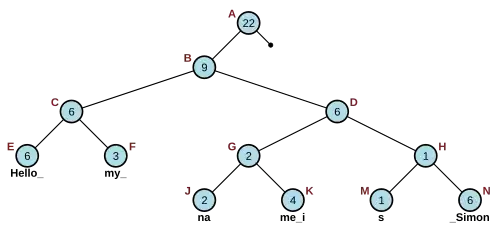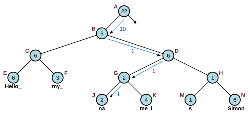Por exemplo, para encontrar o caractere em i=10 na Figura 2.1, inicia-se no nó raiz (A), achar que 22 é maior que 10 e existe um nó filho à esquerda, então vá para este nó (B). 9 é menor do que 10, então, subtrai-se 9 de 10 (deixando-o i=1) e vá para a o filho à direita (D). Em seguida, porque 6 é maior que 1 e há um filho à esquerda, então vá para o nó filho à esquerda (G). 2 é maior que 1 e não há um nó filho à direita, então vá para a esquerda novamente (J). Finalmente, 2 é maior que 1, mas não há nó filho à esquerda, assim, o carácter de cada índice 1 da curta sequência de caracteres "na", é a resposta.