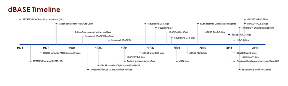 dBASE foi o primeiro SGBD largamente utilizado industrialmente, pelo Apple II, Apple Macintosh e PC's IBM para DOS, onde se tornou um dos softwares mais vendidos durante alguns anos.[1] O dBASE nunca conseguiu migrar com sucesso para a plataforma Microsoft Windows, e foi, em alguns casos, substituído por novos produtos, como Paradox, Clipper, FoxPro e Microsoft Access. O dBase foi vendido para a Borland em 1991, que vendeu os direitos da linha de produtos, em 1999, para a recém-formada dBASE Inc.