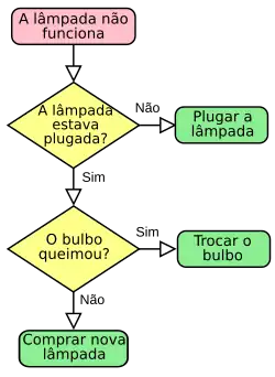 Um fluxograma simples padrão ANSI mostrando como lidar com uma lâmpada que não funciona.