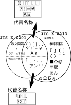 Por outro lado, a computação japonesa antiga usava uma página de código de byte chamada JIS X 0201 para katakana . Eles seriam renderizados na mesma largura que os outros caracteres de byte único, tornando -os caracteres kana de meia largura em vez do kana proporcional normalmente. Embora o próprio padrão JIS X 0201 não tenha especificado a exibição de meia largura para katakana, esse se tornou o recurso visualmente distintivo no Shift JIS entre o katakana JIS X 0201 de um byte e JIS X 0208 de byte duplo. Algumas páginas de código da IBM usaram um tratamento semelhante para o jamo coreano,[1] base no código Hangul de N bytes e sua tradução EBCDIC .