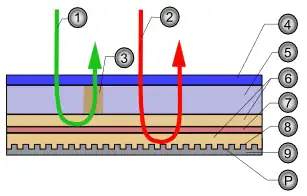Estrutura do HVD 1. Laser verde de leitura/escrita (532nm) 2. Laser vermelho de endereçamento (650 nm) 3. Holograma dos dados 4. Camada de policarbonato 5. Camada holográfica de dados 6. Camadas de distanciamento 7. Camada reflectora (reflecte a luz verde) 8. Camada reflectora de alumínio (reflecte a luz vermelha) 9. Camada transparente P. Camada de endereçamentos (por depressões binárias)