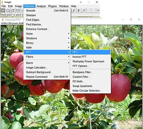 Esse tipo de filtro é muito utilizado para a retirada de ruídos em altas ou baixas frequências. Para se trabalhar no domínio da frequência em imagens, normalmente se utiliza a transformada de Fourier. No ImageJ é possível obter a transformada de Fourier através da opção FFT.