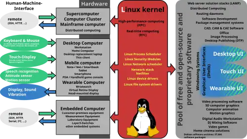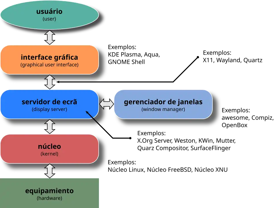 Para Windows temos apenas o ambiente gráfico padrão, nas versões Windows Vista e Windows 7 temos a chamada Windows Aero. Para GNU/Linux temos vários ambientes gráficos, entre eles, o KDE, Gnome, BlackBox, Xfce, LXDE, etc.. Há também a opção de não precisar usar ambientes gráficos. Para prover a funcionalidade do ambiente gráfico existem programas como X.org, XFree86.