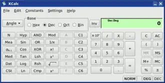 Kcalc é um software de calculadora integrado com o ambiente desktop KDE. Em sua visualização padrão, ele inclui um teclado numérico, botões para somar, subtrair, multiplicar e dividir, colchetes, teclas de memória, porcentagem, inverso, fatorial, quadrado, raiz quadrada e x elevado a y.