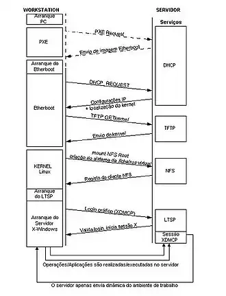 Finalmente, após o núcleo montar a raiz do sistema de ficheiros, irá lançar os scripts de arranque do sistema, que serão responsáveis por colocar o terminal no modo configurado, neste caso, o modo gráfico, utilizando XFree86. Este servidor de ambientes de trabalho em modo gráfico permite autenticar e executar uma sessão num servidor remoto, utilizando o protocolo XDMCP. Caso o utilizador consiga autenticar, será lançado o seu ambiente de trabalho, como se o utilizador estivesse a trabalhar localmente no servidor.