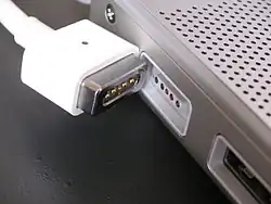 ![]() Conector MagSafe de primeira geração no MacBook Pro | |||