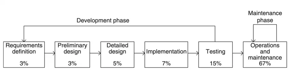 Se concebida como parte do ciclo de vida de desenvolvimento de software, a manutenção é a última e tipicamente a fase mais longa do ciclo,[7][8] compreendendo 80 a 90 por cento do custo do ciclo de vida.[9] Outros modelos consideram a manutenção separada do desenvolvimento de software, em vez disso, como parte do ciclo de vida de manutenção de software (SMLC).[8] Os modelos SMLC normalmente incluem entender o código, modificá-lo e revalidá-lo.[8]