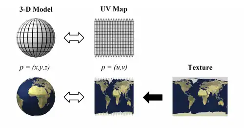 Texturização UV permite que os polígonos que compõem um objeto 3D sejam pintados com a cor (e outros atributos de superfície) de uma imagem comum. A imagem é chamada de mapa de textura UV.[2] O processo de mapeamento UV envolve o mapeamento de pixels na imagem a pontos na superfície no polígono, que geralmente é feito "programaticamente" copiando um pedaço triangular da imagem e colando-o em um triângulo do objeto.[3] UV é uma alternativa ao mapeamento de projeção (ou seja, usando qualquer par de coordenadas X,Y,Z, ou qualquer transformação da posição); apenas mapeia para um espaço de textura ao invés do espaço geométrico do objeto. Mas a computação de renderização utiliza as coordenadas da textura UV para determinar como pintar a superfície em três dimensões.