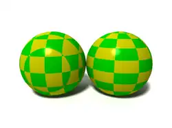 No exemplo à direita, uma esfera recebe uma textura quadriculada de duas maneiras. À esquerda, sem mapeamento UV, a esfera é esculpida a partir de uma textura xadrez no espaço tridimensional euclidiano. Com o mapeamento UV, a textura xadrez tem suas coordenadas UV mapeadas conforme a latitude e longitude da esfera.