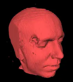 Cabeça e estruturas cerebrais (escondidas) extraída de 150 fatias de um MRI usando marching-cubes (cerca de 150.000 triângulos)