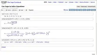 solve(a * x ^ 2 + b * x + c, x) # returns [x == -1/2*(b + sqrt(-4*a*c + b^2))/a, x == -1/2*(b - sqrt(-4*a*c + b^2))/a]
