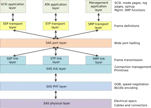 O padrão Serial Attached SCSI define várias camadas (em ordem do mais alto para o mais baixo): aplicativo, transporte, porta, link, PHY e físico. O Serial Attached SCSI compreende três protocolos de transporte: