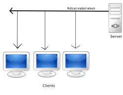 Diagrama do mecanismo de multidifusão, que transmite a mesma cópia da multimídia por toda a rede para um grupo de clientes