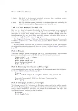 Texinfo permite a estruturação de um documento como um livro com capítulos, seções, referências cruzadas e índices. A fonte é quase texto simples, mas tecnicamente é formatado texto marcado por comandos que começam com "@". Uma amostra de uma parte de um arquivo de origem: