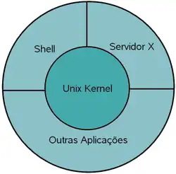 - Núcleo - o núcleo do sistema operacional, a parte que relaciona-se diretamente com o hardware, e que executa num espaço de memória privilegiado. Agenda processos, gerencia a memória, controla o acesso a arquivos e a dispositivos de hardware (estes, por meio dos controladores de dispositivo - drivers - e interrupções). O acesso ao núcleo é feito por chamadas de sistema, que são funções fornecidas pelo núcleo; essas funções são disponibilizadas para as aplicações por bibliotecas de sistema C (libc).