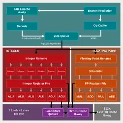Cada núcleo Zen pode decodificar quatro instruções por ciclo de clock e inclui um cache micro-op que alimenta dois agendadores, um para cada segmento inteiro e um de ponto flutuante.[43] Cada núcleo tem duas unidades de geração de endereço, quatro unidades inteiras e quatro unidades de ponto flutuante. Duas das unidades de ponto flutuante são somadores e duas são multiplicadores-somadores. No entanto, o uso de operações de múltiplacação-adição pode impedir a operação de adição simultânea em uma das unidades somadoras.[44] Também há melhorias no preditor de ramificação. O tamanho do cache L1 é de 64 KB para instruções por núcleo e 32 KB para dados por núcleo. O tamanho do cache L2 é de 512 KB por núcleo e o L3 é de 1-2 MB por núcleo. Os caches L3 oferecem 5x a largura de banda dos designs AMD anteriores.