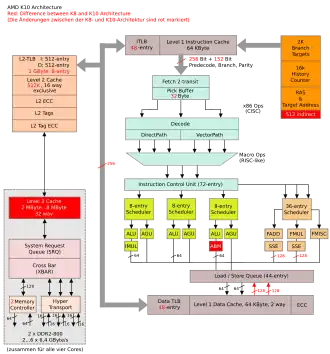 - Dois carregamentos de instruções por ciclo desde o cache L1 (Número estável em relação o K8 mas por conseguinte duas vezes mais dados encarregados por ciclo devido à passagem de instruções 2*64 à 2*128bits).