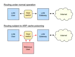 A falsificação ARP pode permitir que um atacante intercepte quadros de dados em uma rede, modifique o tráfego ou interrompa todo o tráfego. Geralmente, o ataque é usado como uma abertura para outros ataques, como negação de serviço, homem no meio ou ataques de sequestro de sessões.[1]