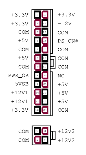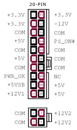 - PS_ON# (power on) é um sinal da placa-mãe para a fonte de alimentação. Quando a linha é conectada ao terra (pela placa-mãe), a fonte de alimentação é ligada. É puxado internamente até +5 V dentro da fonte de alimentação.[2]