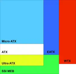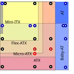 Vários projetos derivados de ATX foram especificados que usam a mesma fonte de alimentação, montagens e arranjo básico do painel traseiro, mas definem padrões diferentes para o tamanho da placa e número de slots de expansão. O ATX padrão oferece sete slots com espaçamento de 20 mm (0,8 pol.); o tamanho microATX popular remove 2,4 polegadas (61 mm) e três slots, deixando quatro. Aqui a largura refere-se à distância ao longo da borda do conector externo, enquanto a profundidade é da frente para trás. Observe que cada tamanho maior herda todas as áreas de cores anteriores (menores).