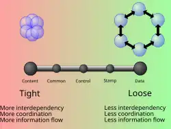 O acoplamento é geralmente contrastado com coesão. O baixo acoplamento geralmente se correlaciona com alta coesão e vice-versa. O baixo acoplamento é frequentemente um sinal de um sistema de computador bem estruturado e de um bom design, e quando combinado com alta coesão, suporta os objetivos gerais de alta legibilidade e facilidade de manutenção.