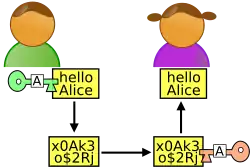 - Alice e Bob. Geralmente, Alice quer enviar uma mensagem para Bob. Estes nomes foram usados por Ronald Rivest no artigo da Comunicação de 1978 da ACM apresentando o sistema criptográfico RSA e, em Um Método para Obtenção de Assinaturas Digitais e Encriptação de Chave Pública publicado 4 de abril de 1977, revisado em 1° de setembro de 1977 como memorando técnico LCS/TM82 Memo . Rivest nega que estes nomes tenham qualquer relação com o filme de 1969 Bob & Carol & Ted & Alice, como é ocasionalmente sugerido por outros.