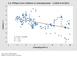 Um gráfico de dispersão que ilustra a correlação entre duas variáveis (inflação e desemprego) medidas em pontos no tempo