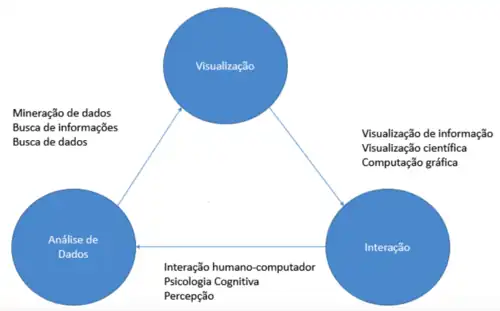 A figura a seguir mostra as áreas de pesquisa relacionadas à Análise Visual. Além da visualização e da análise de dados, a interação incluindo as áreas de cognição e percepção, possuem um papel muito importante no que diz respeito à comunicação entre humanos e computadores. Já a visualização está relacionada com as áreas de Visualização de Informações e Computação Gráfica. A análise de dados está relacionada com técnicas e metodologias de gerenciamento de dados, representação do conhecimento e mineração de dados.
