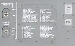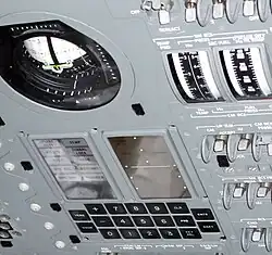O visor e o teclado (DSKY) da interface do AGC, montado no painel de controle do módulo de comando, com o Flight Director Attitude Indicator (FDAI) acimaLista parcial dos códigos de verbs e nouns do AGC, escritas no painel lateral para consultas rápidas.