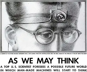 O ensaio As We May Think de Vannevar Bush, primeiro publicado em The Atlantic Monthly em julho de 1945, argumentava que quando os humanos virassem as costas para a guerra, esforços científicos deveriam promover o aumento de habilidades físicas para tornar mais acessível todo o conhecimento humano previamente coletado.