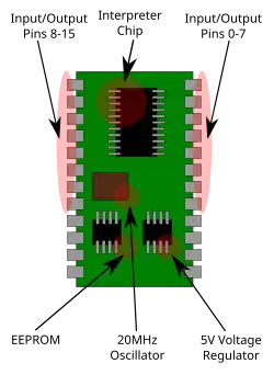 A forma de programação é feito em BASIC também chamado de PBASIC[2][3]. Ele incorpora algumas funções de microcontrolador como PWM, comunicação serial, I²C e comunicação 1-Wire para ligar em LCD, servos motores, leitura analógica e digital.