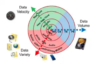 • Variedade: as fontes de dados são muito variadas, o que aumenta a complexidade das análises. Essas fontes podem ser desde transações comerciais, redes sociais, radares, sensores, celulares, computadores, até sites de reclamações, “curtidas” nas redes sociais, coordenadas de GPS, drones, etc.[13] Além das variedades das fontes, existem também os diferentes formatos e tipos de dados, desde dados estruturados, dados numéricos em bancos de dados tradicionais, até os dados não estruturados, como textos, e-mail, vídeos, áudios e dados de transações financeiras. Um dos maiores desafios do big data é gerenciar todos esses diferentes tipos de dados e fontes ao mesmo tempo.[14]