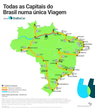 Mapa de divulgação de viagem rodoviária por todas as capitais do Brasil com BlablaCar por Brasil Em Mapas.