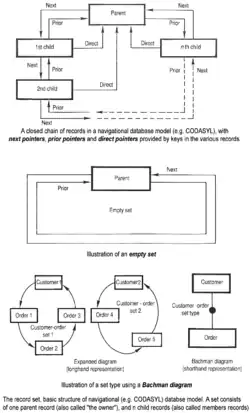 Exemplo de estrutura padrão do modelo de banco de dados CODASYL. O set consiste em um registro dono e n registros membros (no diagrama eles são descritos como "pai" e "filho", mas na terminologia CODASYL se usa "dono" e "membro"). No exemplo acima, estamos vendo um set básico que representa um relacionamento 1:N (Dono:Membro).