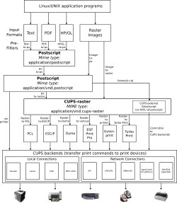 CUPS pode converter dados fornecidos tanto dados em PostScript ou diretamente em dados raster. Se ela é convertida em dados PostScript um filtro adicional é aplicado chamado de pré-filtro, que corre os dados PostScript através de outro conversor PostScript para que possa adicionar opções específicas da impressora como a seleção de intervalos de páginas para impressão, modo de configuração n-up e dispositivos específicos de outras coisas.[25] Após a pré-filtragem é feita, os dados podem ser enviados diretamente para CUPS backend. Se estiver usando uma impressora PostScript, ou ele pode ser passado para outro filtro como Foomatic por linuxprinting.org. Alternativamente, pode ser passado para Ghostscript, que converte o PostScript em um intermediário CUPS-raster formato.[26] O formato raster intermediário é então passada em um filtro final que converte os dados raster para uma impressora de formato específico. Os filtros padrão incluído com CUPS incluem: