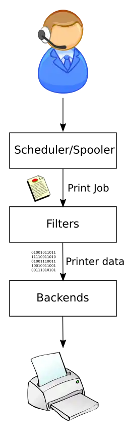 O CUPS oferece mecanismos que permitem que serviços de impressão sejam enviados a impressoras de um modo padrão. Os dados de impressão vão para um escalonador[6] que envia o serviço para um sistema de filtragem que converte o serviço para um formato que a impressora vai entender.[7] O sistema de filtragem então, passa os dados para um sistema em segundo-plano— um filtro especial que envia os dados para o dispositivo ou conexão de rede.[8] O sistema faz uso extensivo de PostScript e rastreio de dados para converter os dados em um formato útil a impressora padrão.