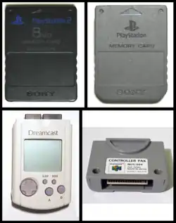 Com o advento dos jogos distribuídos em discos óticos, os consoles de videogame adotaram como solução de armazenamento de dados os cartões de memória, conhecidos como memory cards (no Brasil) – apesar de ter sido adotado também no console Neo Geo em 1990 para troca de dados entre as versões doméstica e arcade.[4][5]