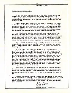 Hal Singer da Micro-8 Newsletter publicou uma carta aberta ao Ed Roberts da MITS. Hal apontou que MITS prometeu um computador por US $ 395, mas o preço de um sistema de trabalho foi de US $ 1000. Ele sugeriu uma ação de classe ou de uma investigação da Comissão Federal de Comércio por falsa publicidade estava em ordem. Hal também observou que os rumores estavam circulando que Bill Gates desenvolveu BASIC em um computador da Universidade de Harvard que foi financiado pelo governo dos EUA. Por que os clientes devem pagar por software já pago pelo contribuinte?[26]