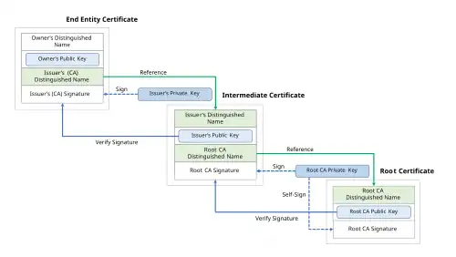 Uma autoridade de certificação pode emitir vários certificados na forma de uma estrutura em árvore. Um certificado raiz é o primeiro certificado da árvore, cuja chave privada é usada para "assinar" outros certificados. Todos os certificados assinados pelo certificado raiz, com o campo "CA" definido como verdadeiro, herdam a confiabilidade do certificado raiz - uma assinatura por um certificado raiz é um tanto análogo a "notarizar" a identidade no mundo físico. Esse certificado é denominado certificado intermediário ou certificado CA subordinado. Certificados mais abaixo na árvore também dependem da confiabilidade dos intermediários.